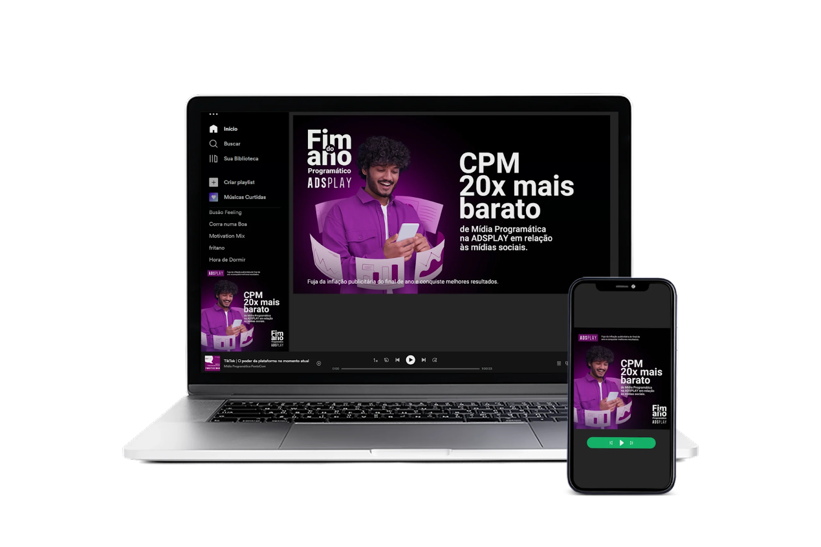 No Spotify, impacte usuários logados com anúncios em vídeo, áudio e interativos para contar a história da sua marca. Alcance resultados em um ambiente premium, onde os usuários estão envolvidos, proporcionando uma experiência de alta qualidade.